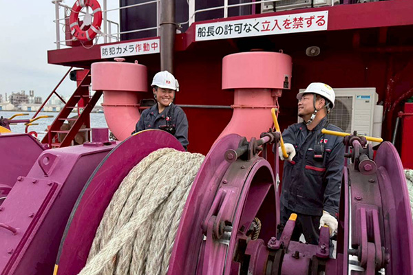 海と船の上の仕事ですので、雨と風の強い日は大変なこともありますし、自然を相手する辛さもあります。時には高いところに登ることもあります。この仕事は、お互いに命を預け合う仕事ですから、安全を守るためにも「チームワークと協調性」を大切にしています。父親が子供に接するように愛情をもって、兄や姉が弟を心配するように仲間や後輩を心配して、支え合います。